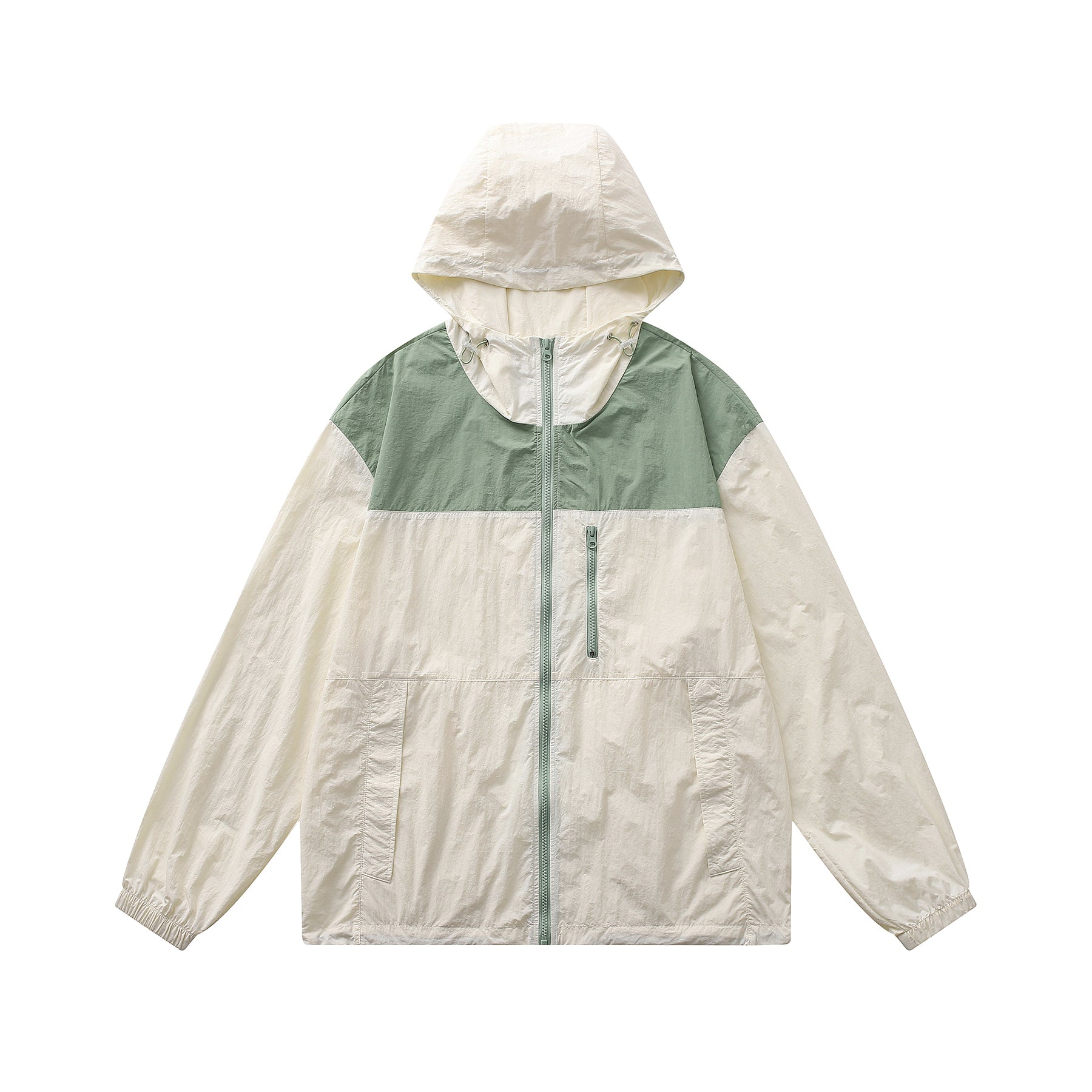 Men's color blocked hooded long sleeved sunscreen jacket in apricot color