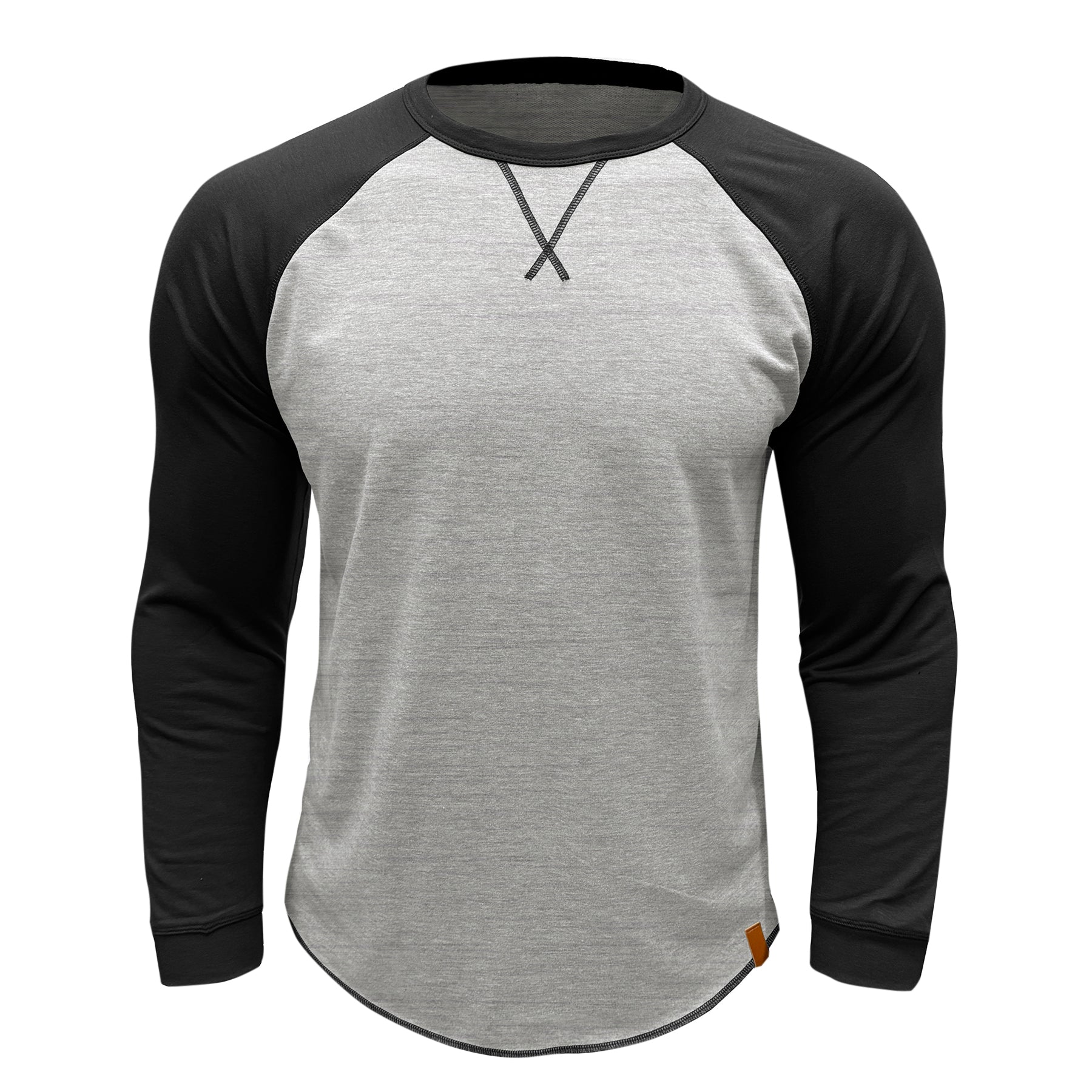 Men's long sleeved round neck casual T-shirt gray white with black